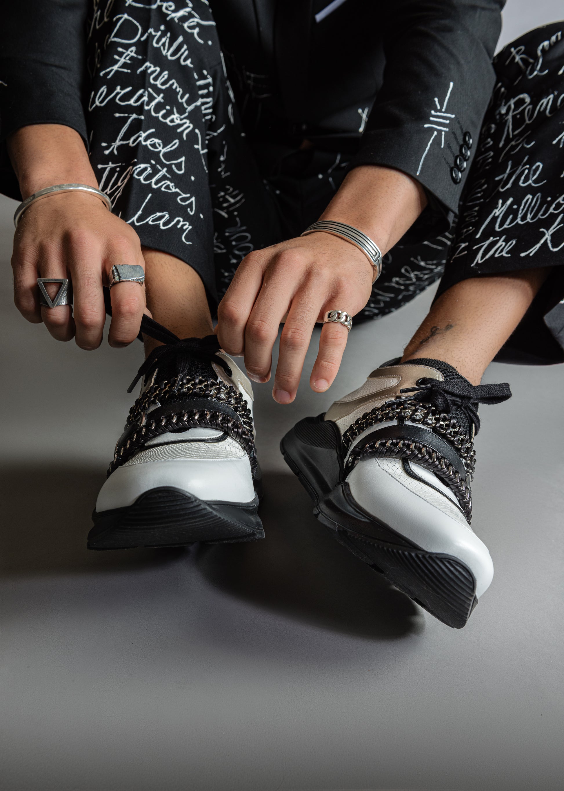 Yes we can! Together We Can achieve anything, and wearing the Together We Can sneaker we can too. This sneaker is for all of you to remember that together we are stronger and that our unique personas and differences can create magic, just like all the different materials in this sneaker are what makes it special. The two leather weaved chains and buckle give it a distinct touch while bringing all the details of the collection together in perfect harmony.